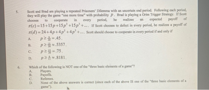 Solutions for Chapter 17 Problem 5QCM. The prisoners dilemma is a two-person game illustrating thata. Prevent firms from acting in ways that reduce competition.
